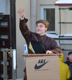 Lyseon sisäpihalle kerääntyi paljon ihmisiä seuraamaan abien kantamista rekkoihin. Kirkkaassa auringonpaisteessa karkit lensivät ja lapset hihkuivat onnellisina.